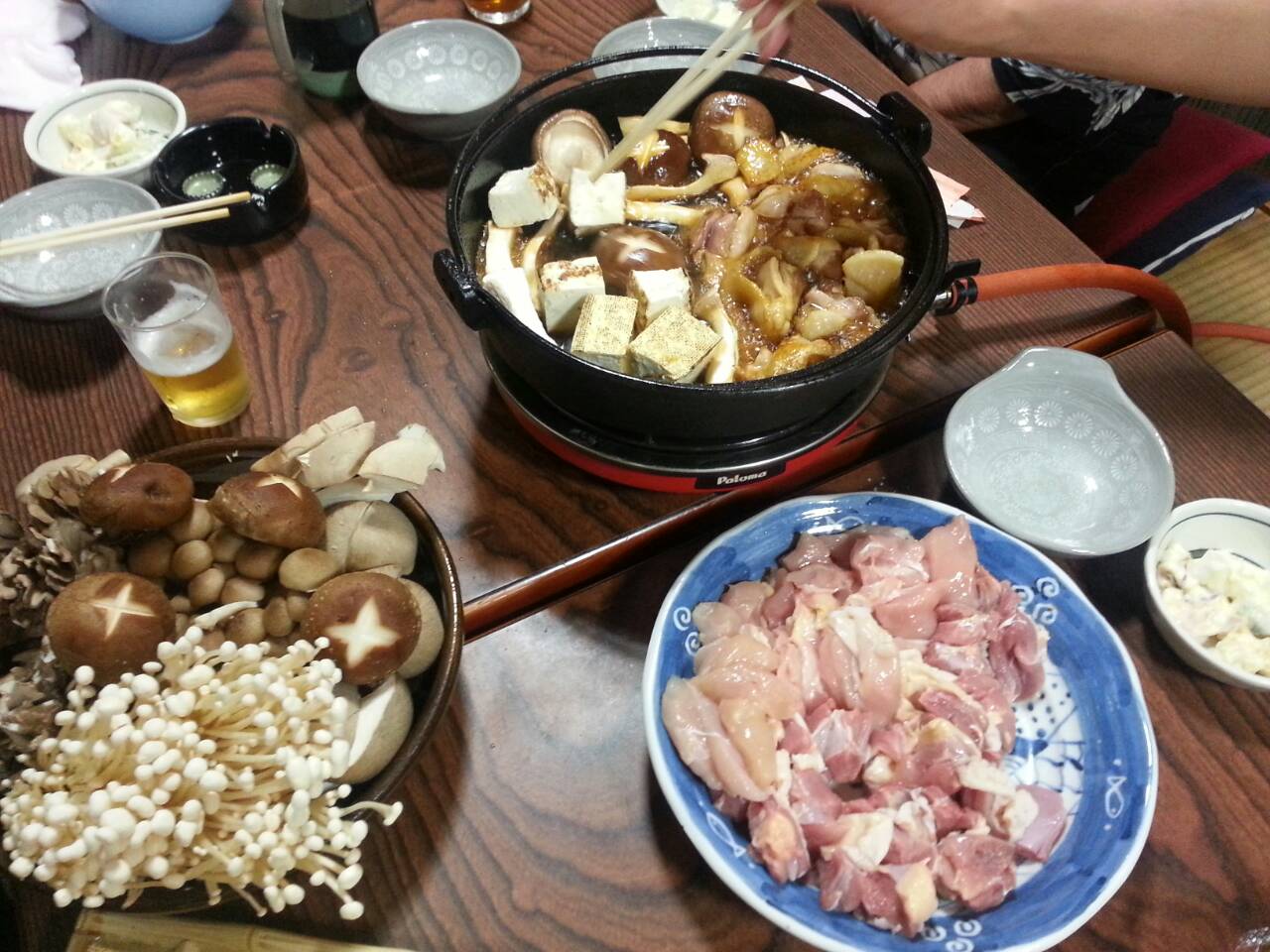 ひきずり・・・ 投稿日時: 2014年6月19日 投稿者: aiaikaihatsu 昨夜は、月に1度の定例呑み会『金谷千代会』 6月のメニューは『コーチンひきずり鍋』 食べやすく、一口サイズに肉をそぎ、砂糖、しょうゆ、酒で味を調え、卵に絡ませて食す! 最高の味! 〆はうどんを入れて・・・。 この「ひきずりの」名称の由来は『鶏肉を鍋の底で引きずって食べていた、もう一度食べたくなるほど引きずられる味、などの意味から「ひきずり鍋」の名称になったという』 他の地域ではみなさんご存じの『すき焼き』です。